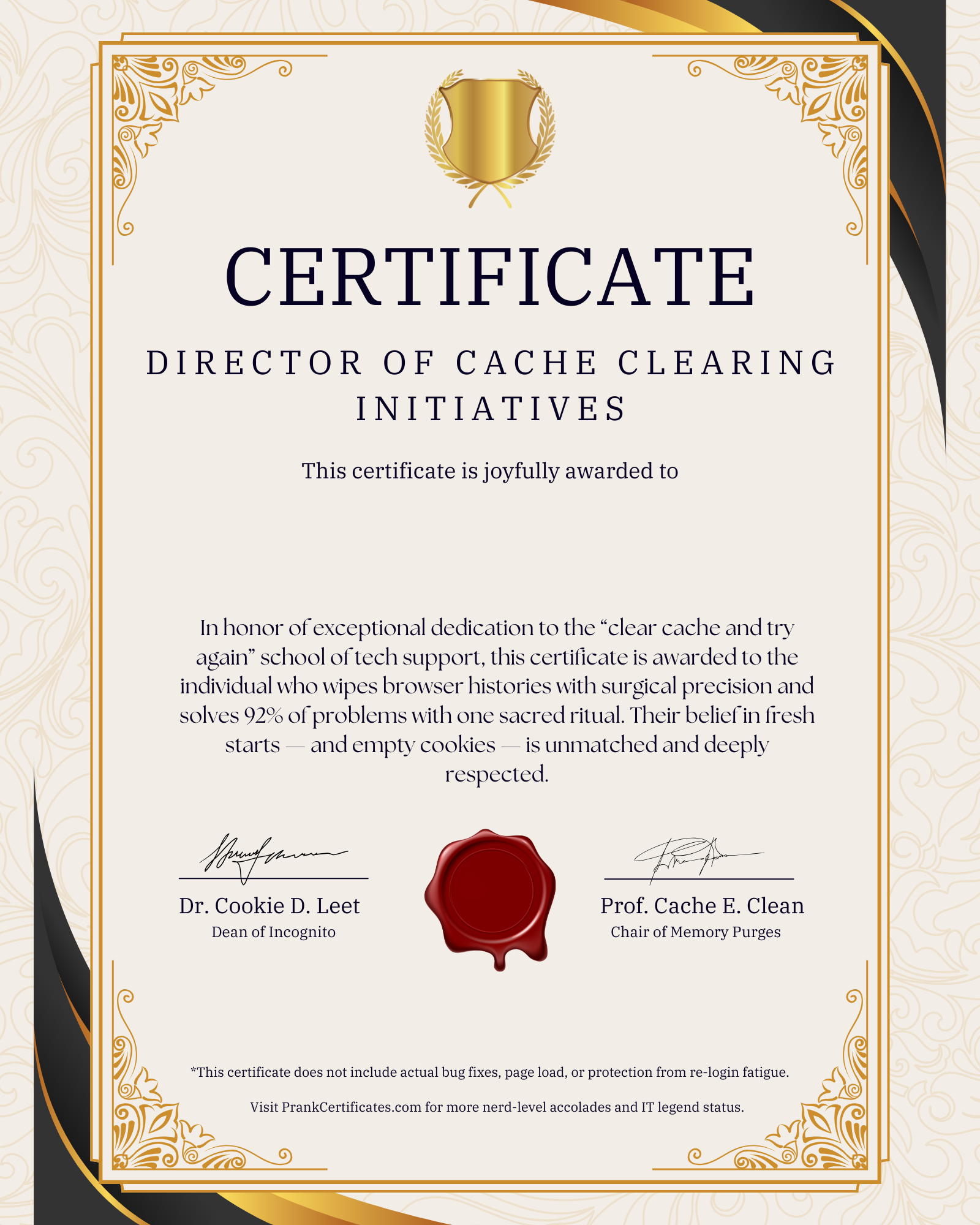 🎓 Introducing the Director of Cache Clearing Initiatives Certificate, proudly awarded by Tempfile Technical Institute — an honorary title for the digital wizard who believes no problem is too stubborn for a good ol’ refresh and cookie wipe.