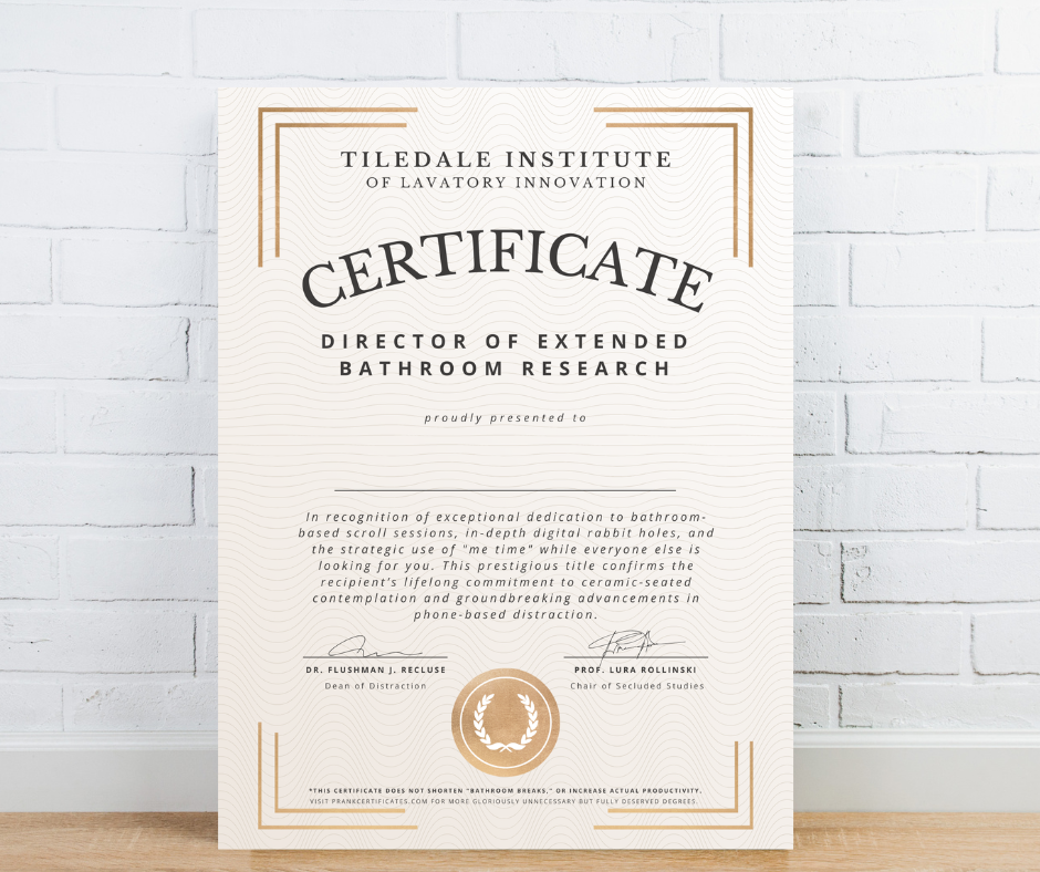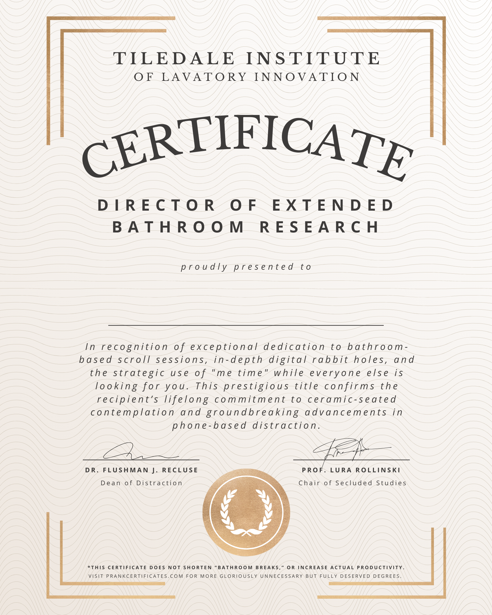 🎓 Presenting the Director of Extended Bathroom Research Certificate, awarded by the prestigious Tiledale Institute of Lavatory Innovation. This honor recognizes outstanding dedication to long bathroom sessions, uninterrupted scrolling, and expertly timed “I’ll be out in a minute” statements.