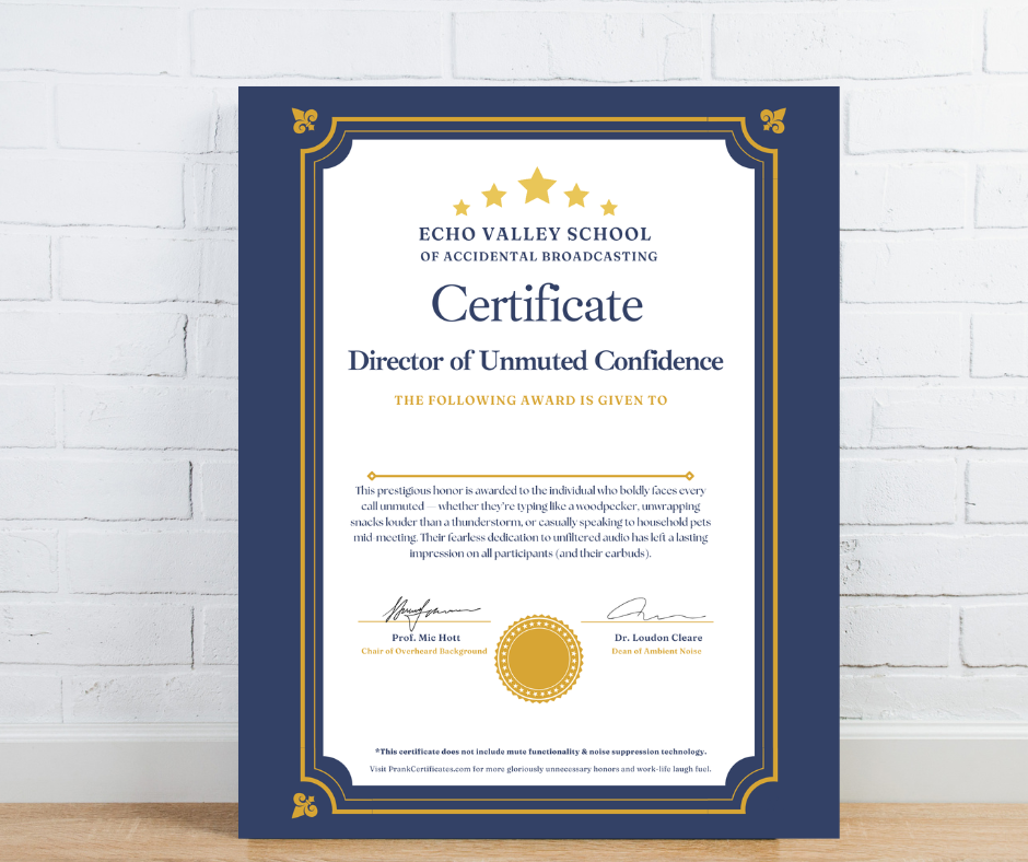 🎓 Awarded by the notorious Echo Valley School of Accidental Broadcasting, this custom certificate proudly recognizes the fearless few who treat every virtual meeting like an open mic night — complete with typing, snack rustling, and mid-call conversations with pets, kids, or the microwave.