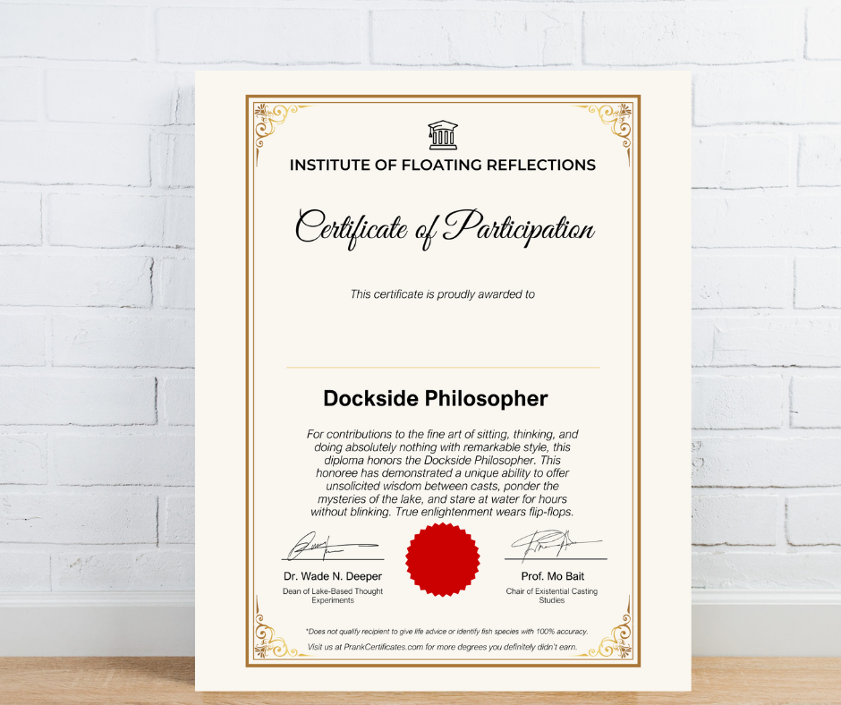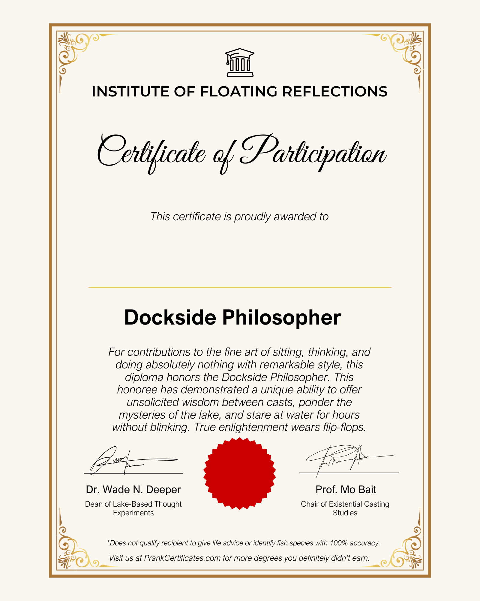 🎓 Presenting the Dockside Philosopher Certificate, proudly issued by the Institute of Floating Reflections. This hilarious diploma is for the friend who brings deep thoughts and even deeper chair indents to every fishing trip.