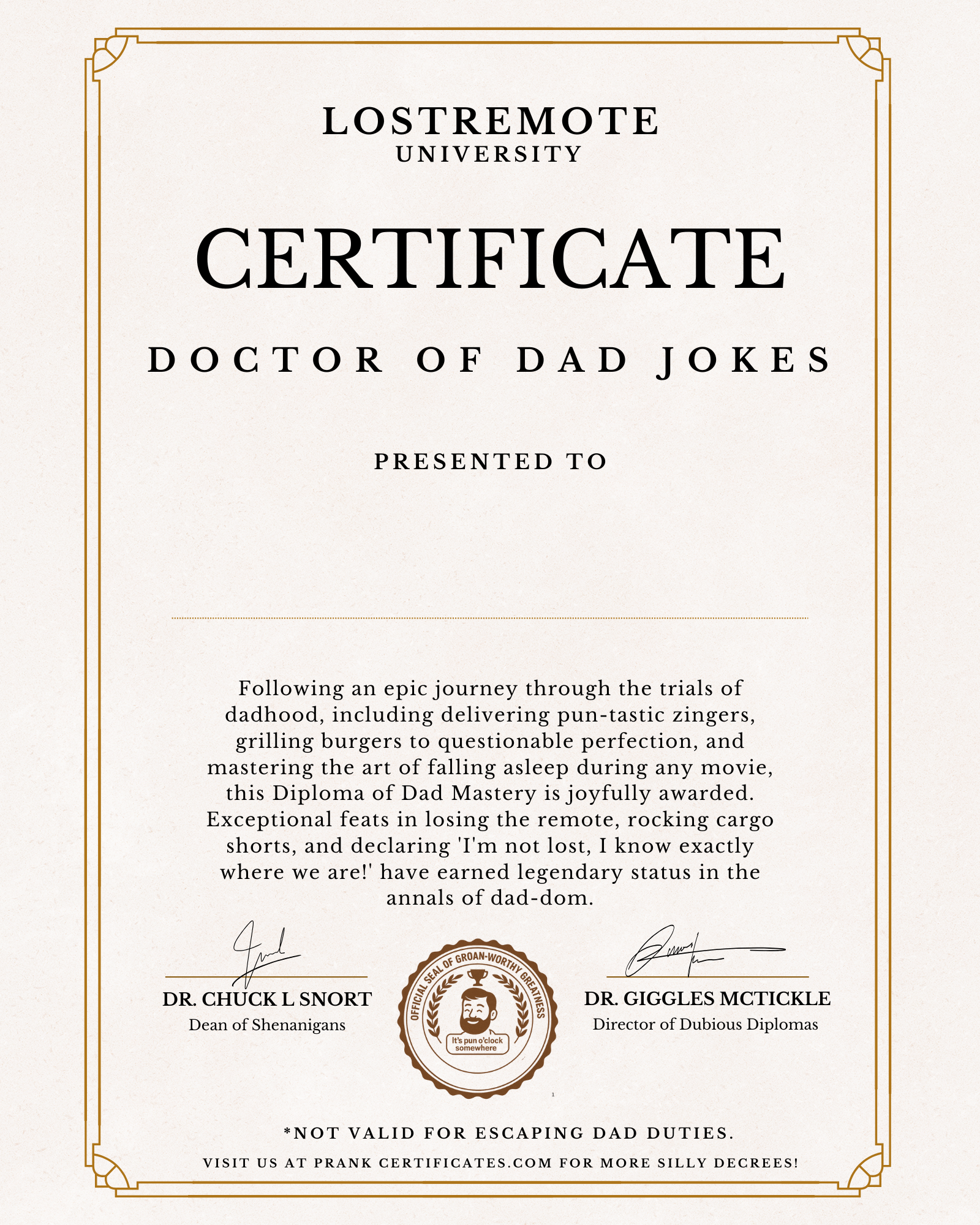🎉 Presenting the Doctor of Dad Jokes Certificate from the (very real, totally unaccredited) Lostremote University, the world’s most prestigious institution in eye-roll-worthy excellence.