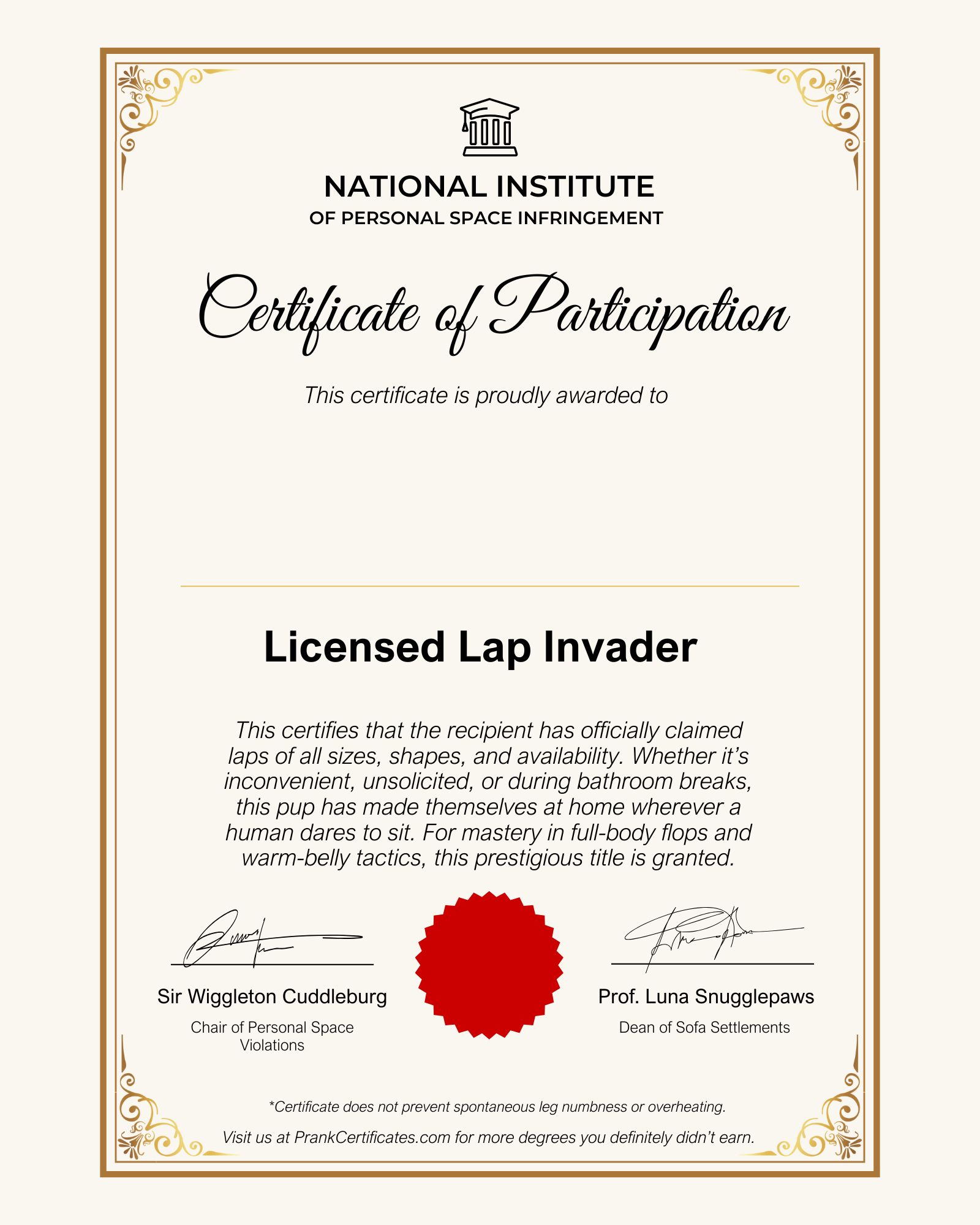 🎓 Introducing the Licensed Lap Invader Certificate — officially issued by the National Institute of Personal Space Infringement. This diploma celebrates the furball that believes your lap was made for them, 24/7, no exceptions.