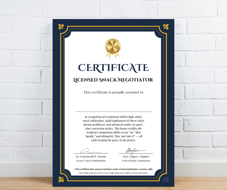 š Presenting the Licensed Snack Negotiator Certificate,Ā honoring exceptional talent in mid-afternoon peacekeeping, wrapper diplomacy, and last-minute bribe distribution.
