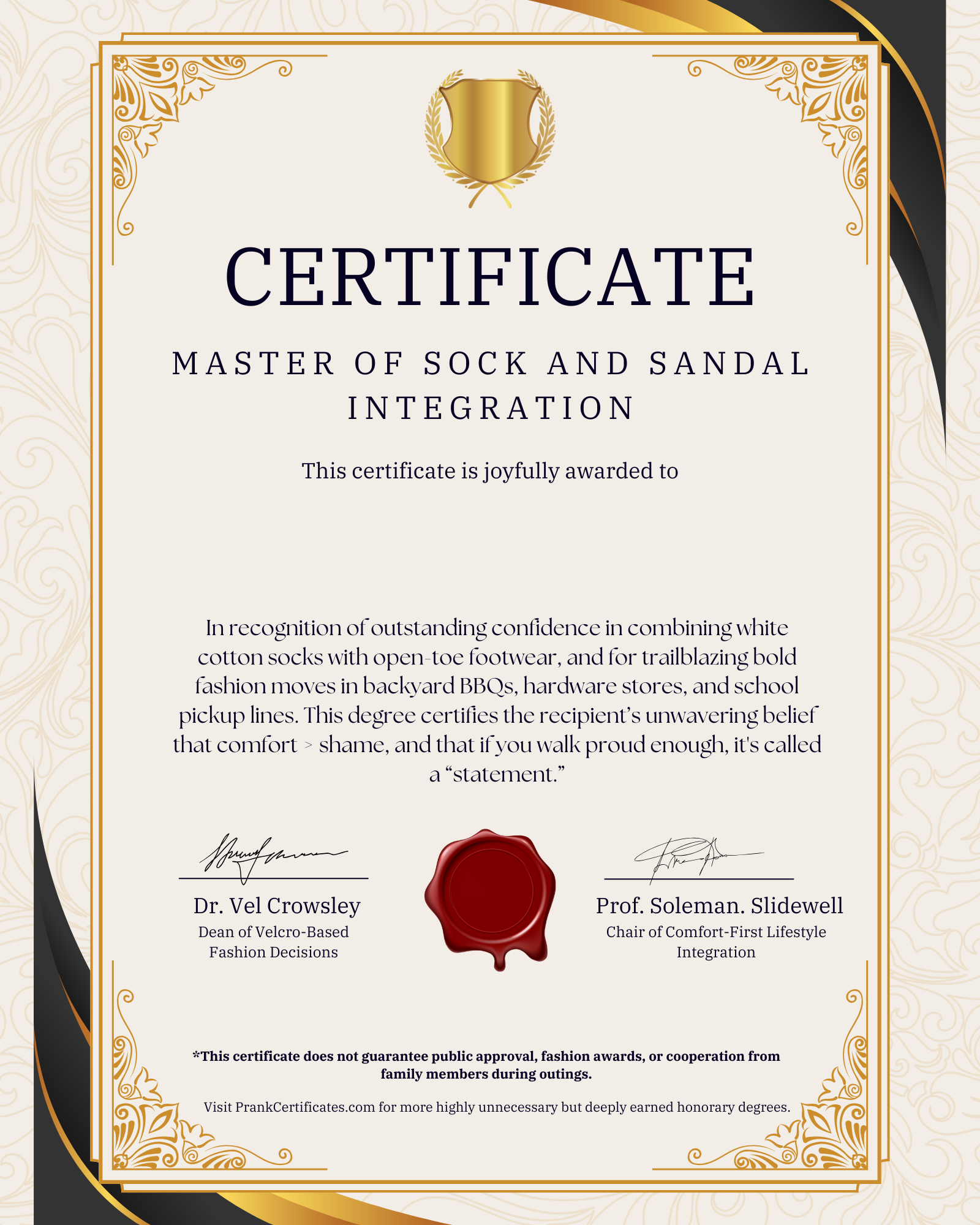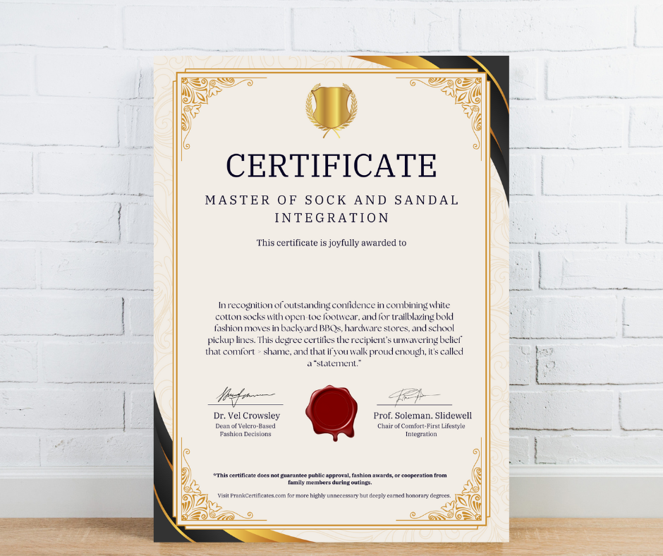 š Introducing the Master of Sock and Sandal Integration Certificate, conferred by the highly prestigious (and deeply unfashionable) Fashionapolis Academy of Questionable Choices. This diploma celebrates elite-level comfort prioritization, unwavering confidence, and the ability to strut around the block like itās a Milan runway ā even in cargo shorts.
