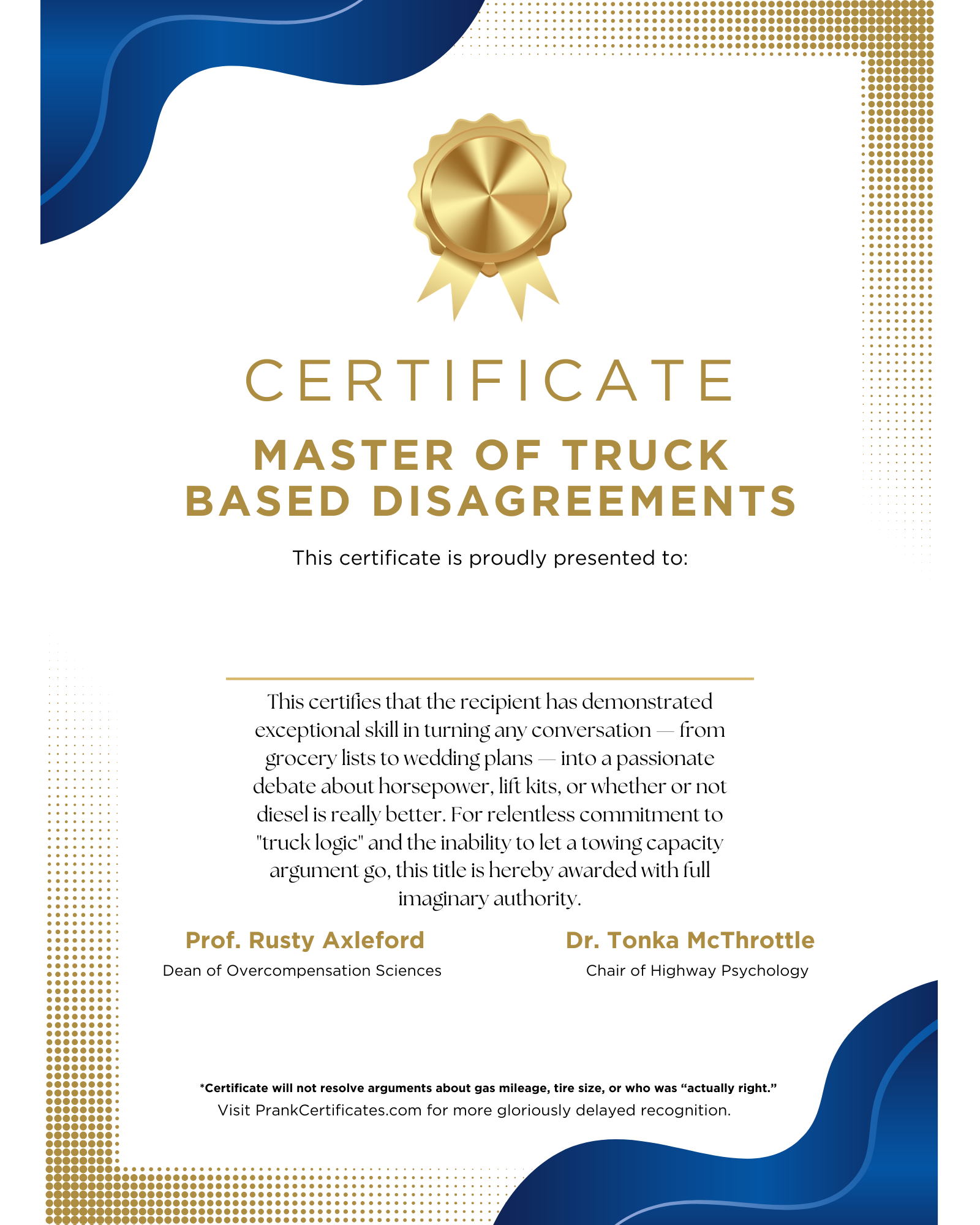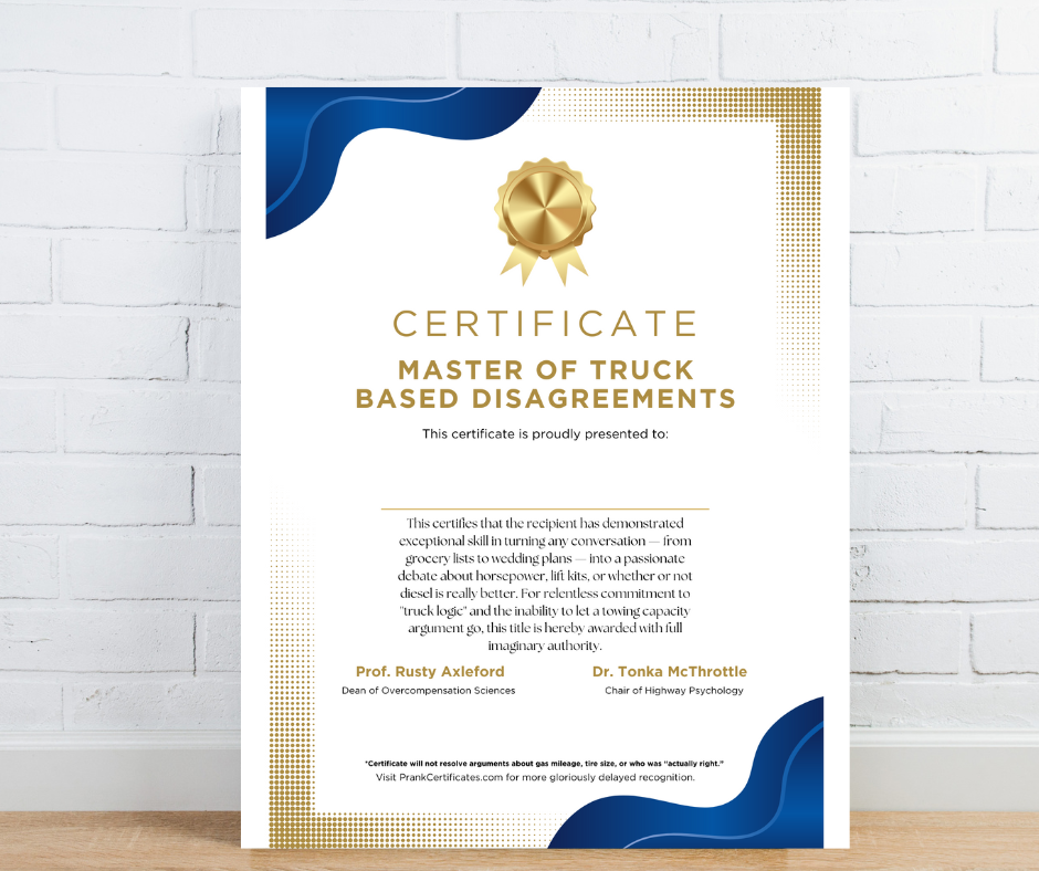 š Introducing the Master of Truck-Based Disagreements Certificate, issued by the Academy of Aggressive Acceleration Studies. A proud (and totally fake) honor for those who canāand willādebate 4x4 gear ratios until someone walks away.