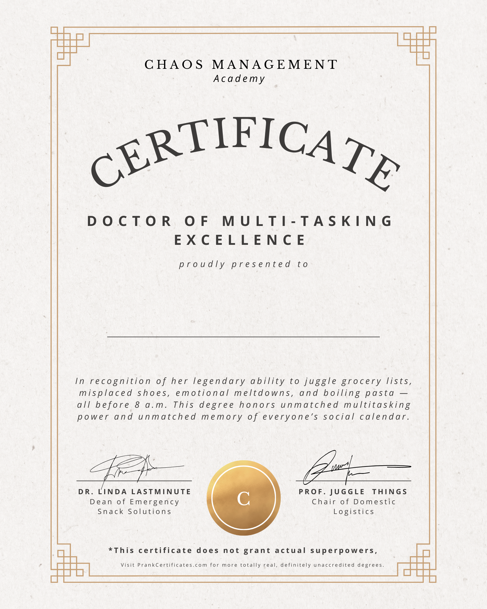 🎓 Presenting the Doctor of Multi-Tasking Excellence Certificate, issued by the semi-credible Baffington Institute of Domestic Strategy, in honor of advanced-level juggling of chaos, calm, and carpool schedules.