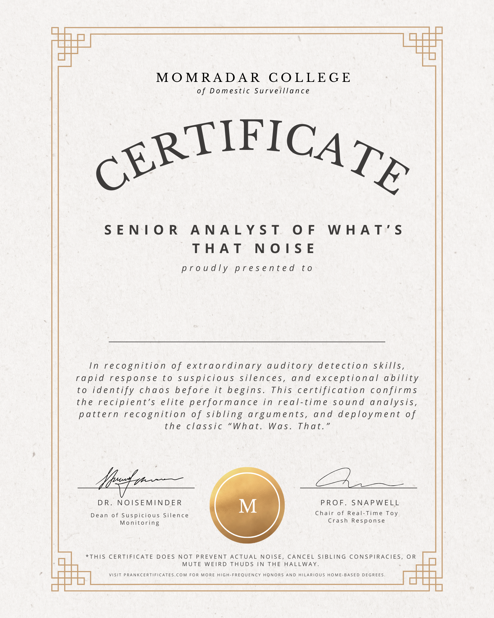 🎓 Introducing the Senior Analyst of What’s That Noise Certificate, issued by the elite Momradar College of Domestic Surveillance. This degree celebrates superior audio detection, situational suspicion, and the magical ability to identify mischief by tone, pitch, and decibel.