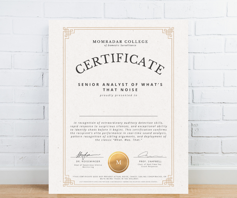 🚨 Disclaimer: This certificate does not mute suspicious thuds, cancel sibling fights, or reduce the need to yell “WHAT ARE YOU DOING?!” from across the house.